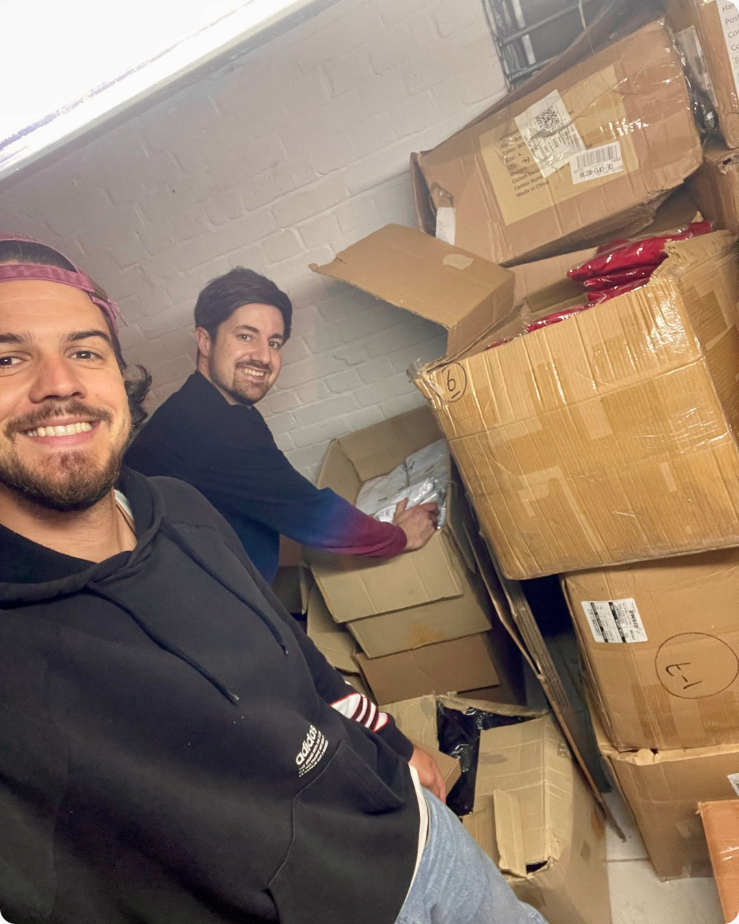 The two founders inspecting the first jerseys - in Marc's basement.